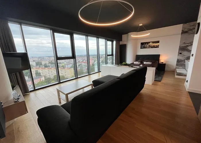 Offering a sundeck and a play area, the 60 m^2 Hanza Tower - Luxurious Apartment 60M2 - 15Th Floor City View Szczecin is situated in the Srodmiescie district, around 25 minutes' walk from Cathedral Basilica of St. James the Apostle. Welcoming guests with a Turkish steam room, a plunge pool, and a Turkish bath, this 1-bedroom apartment lies just a short drive from Papugarnia Carmen Szczecin.